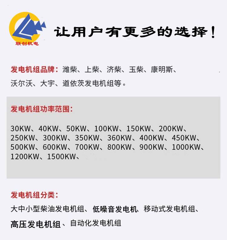 | 主营产品 | 柴油发电机组 , 汽油发电机 , 康明斯柴油发电机组 ,低噪音柴油发电机组,移动柴油发电机组,玉柴柴油发电机组,上柴柴油发电机组,潍柴柴油发电机组 | ||