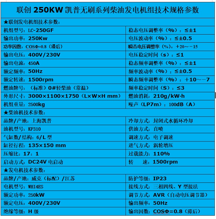 纯铜电机 凯普250KW柴油发电机组 合肥发电机厂家 电调省油,这一标题所涵盖的关键词不仅指明了产品的性能优势和制造地,还直接触及了用户对柴油发电机组的核心需求。宁波市鄞州联创机电有限公司作为一家专业的合肥发电机组厂家,依托多年的行业经验与技术积累,推出了性价比极高的上海凯普柴油发电机组系列,尤其是250KW柴油发电机组受到了市场广泛关注。本文将从多个角度全方位介绍这款产品的技术特点、经济价值以及使用体验。