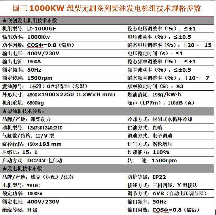 综合性能、油耗优势、稳定可靠的品牌背景,1000千瓦潍柴发电机组以价格596000.00元每台,体现了较高的性价比。对于需要配置高效消防备用电源或大型供电保障系统的企事业单位来说,是值得投资的一项资本。建议客户结合实际用电需求及备用容量规划,确保选型合理,发挥发电机组Zui大效能。