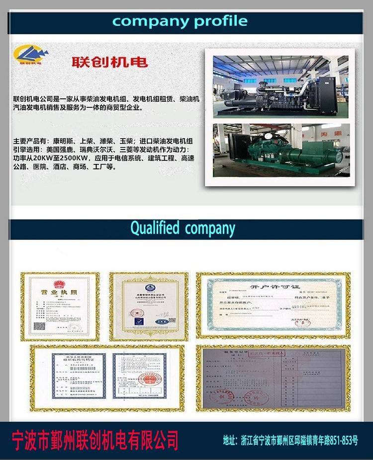 | 公司简介 | 宁波市鄞州联创机电有限公司(前身宁波星光电机)是一家从事柴油发电机组、柴油机,农副加工机械销售及服务为一体的商贸型企业。本公司具有成熟的柴油发电机组配套技术,以及一支经验丰富的维修售后服务团队,可随时为客户提供高品质的产品和令客户满意的优质服务!公司坚持以服务创新,精益求精为动力,为客户提供高品质产品为宗旨,诚信经营,薄利多销,以赢得广阔的市场发展空间。长期以来,专注于国产及进口高品质的柴油发电机 ... | ||