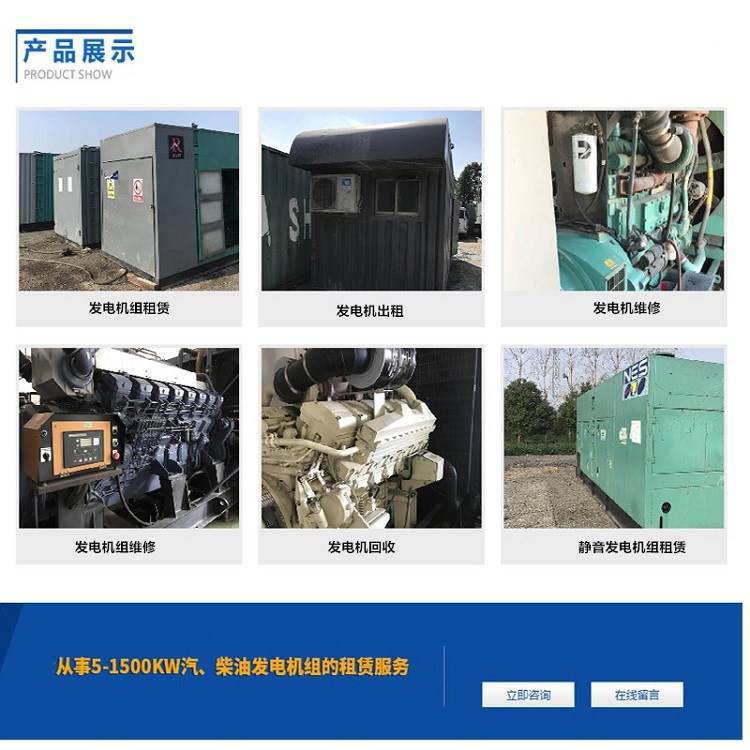 | 主营产品 | 柴油发电机组 , 汽油发电机 , 康明斯柴油发电机组 ,低噪音柴油发电机组,移动柴油发电机组,玉柴柴油发电机组,上柴柴油发电机组,潍柴柴油发电机组 | ||