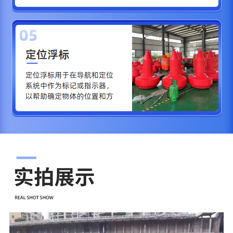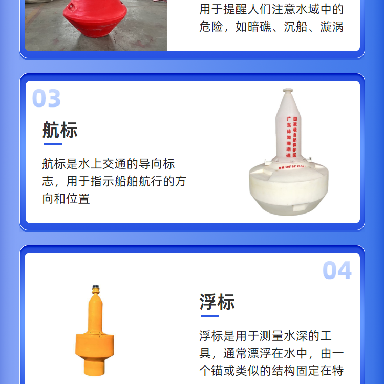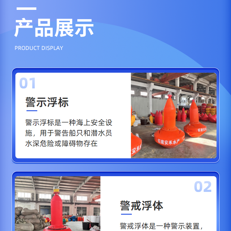 | 主营产品 | 警示浮标,管道浮筒,拦污浮筒,警示浮筒,水电站拦污排,水库河道拦污设备浮体,水上警戒线,塑料浮球,浮筒,浮标,浮漂,浮台等 | ||