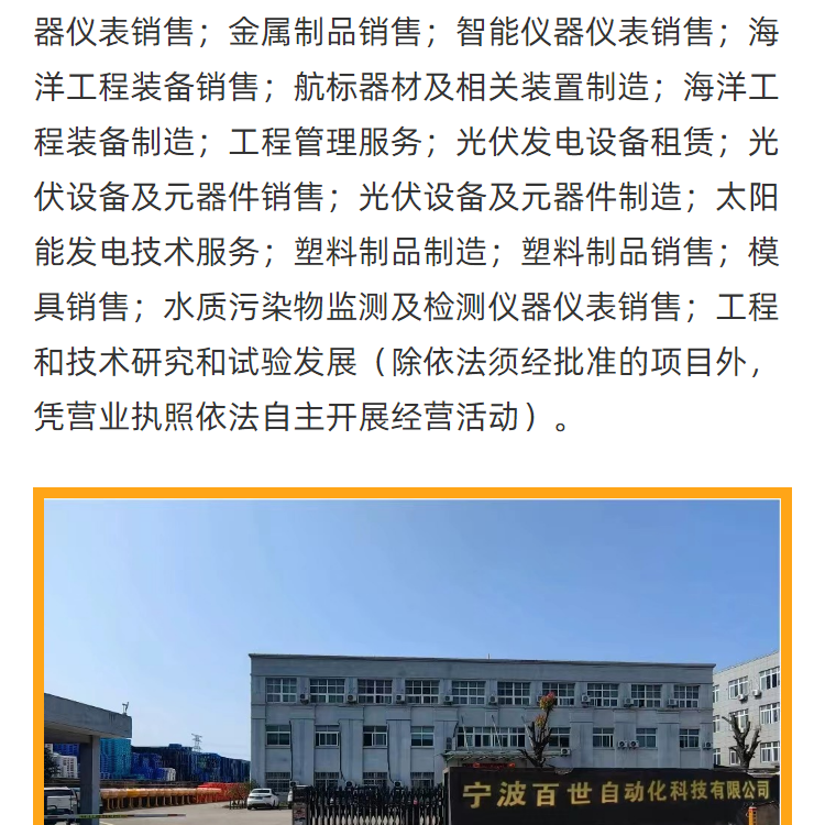 | 经营范围 | 宁波百世自动化科技有限公司成立于2019年12月16日,注册地位于浙江省慈溪滨海经济开发区香山东路155号1幢1层,法定代表人为郭亦巧。经营范围包括一般项目:技术服务、技术开发、技术咨询、技术交流、技术转让、技术推广;技术进出口;货物进出口;进出口代理;机械设备研发;仪器仪表销售;金属制品销售;智能仪器仪表销售;海洋工程装备销售;航标器材及相关装置制造;海洋工程装备制造;工程管理服务;光伏发电设备租赁;光伏设备及元器件销售;光伏设备及元器件制造;太阳能发电技术服务;塑料制品制造;塑料制品销售;模具销售;水质污染物监测及检测仪器仪表销售;工程和技术研究和试验发展(除依法须经批准的项目外,凭营业执照依法自主开展经营活动)。许可项目:输电、供电、受电电力设施的安装、维修和试验;建设工程施工;建设工程设计(依法须经批准的项目,经相关部门批准后方可开展经营活动,具体经营项目以审批结果为准) | ||
