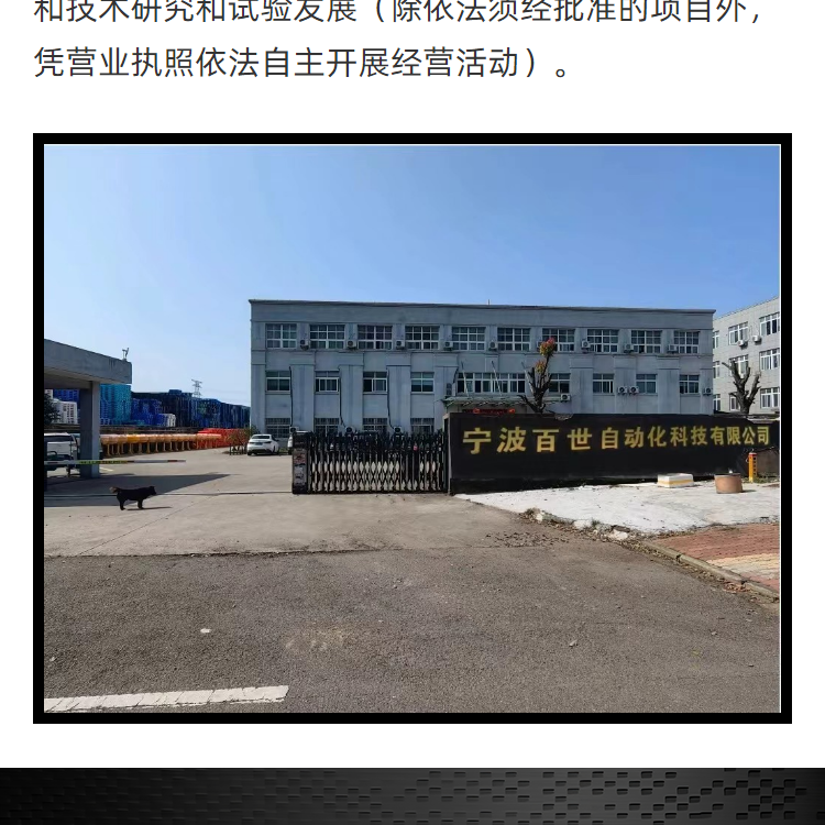 | 经营范围 | 宁波百世自动化科技有限公司成立于2019年12月16日,注册地位于浙江省慈溪滨海经济开发区香山东路155号1幢1层,法定代表人为郭亦巧。经营范围包括一般项目:技术服务、技术开发、技术咨询、技术交流、技术转让、技术推广;技术进出口;货物进出口;进出口代理;机械设备研发;仪器仪表销售;金属制品销售;智能仪器仪表销售;海洋工程装备销售;航标器材及相关装置制造;海洋工程装备制造;工程管理服务;光伏发电设备租赁;光伏设备及元器件销售;光伏设备及元器件制造;太阳能发电技术服务;塑料制品制造;塑料制品销售;模具销售;水质污染物监测及检测仪器仪表销售;工程和技术研究和试验发展(除依法须经批准的项目外,凭营业执照依法自主开展经营活动)。许可项目:输电、供电、受电电力设施的安装、维修和试验;建设工程施工;建设工程设计(依法须经批准的项目,经相关部门批准后方可开展经营活动,具体经营项目以审批结果为准) | ||