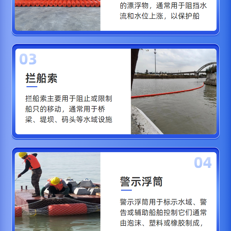 | 主营产品 | 警示浮标,管道浮筒,拦污浮筒,警示浮筒,水电站拦污排,水库河道拦污设备浮体,水上警戒线,塑料浮球,浮筒,浮标,浮漂,浮台等 | ||