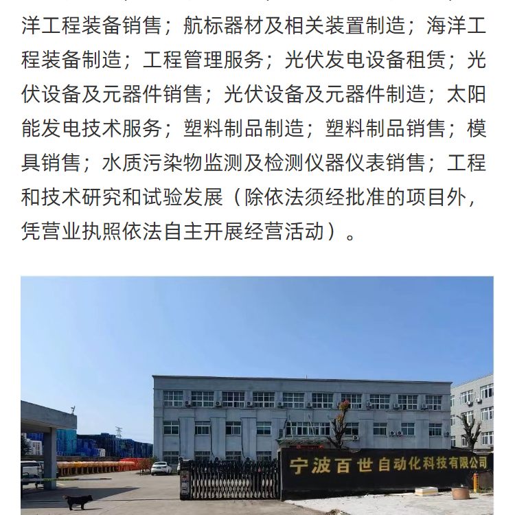 | 经营范围 | 宁波百世自动化科技有限公司成立于2019年12月16日,注册地位于浙江省慈溪滨海经济开发区香山东路155号1幢1层,法定代表人为郭亦巧。经营范围包括一般项目:技术服务、技术开发、技术咨询、技术交流、技术转让、技术推广;技术进出口;货物进出口;进出口代理;机械设备研发;仪器仪表销售;金属制品销售;智能仪器仪表销售;海洋工程装备销售;航标器材及相关装置制造;海洋工程装备制造;工程管理服务;光伏发电设备租赁;光伏设备及元器件销售;光伏设备及元器件制造;太阳能发电技术服务;塑料制品制造;塑料制品销售;模具销售;水质污染物监测及检测仪器仪表销售;工程和技术研究和试验发展(除依法须经批准的项目外,凭营业执照依法自主开展经营活动)。许可项目:输电、供电、受电电力设施的安装、维修和试验;建设工程施工;建设工程设计(依法须经批准的项目,经相关部门批准后方可开展经营活动,具体经营项目以审批结果为准) | ||