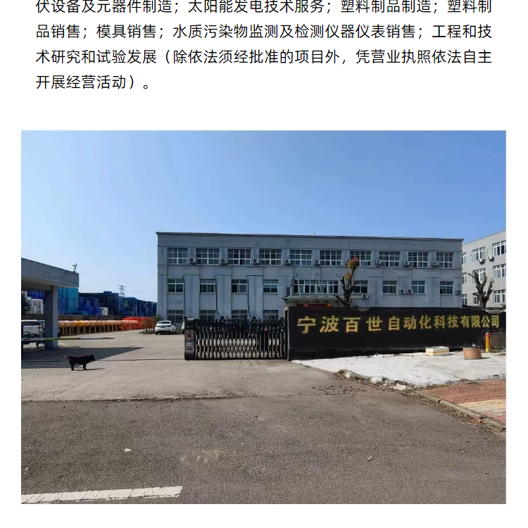 | 经营范围 | 宁波百世自动化科技有限公司成立于2019年12月16日,注册地位于浙江省慈溪滨海经济开发区香山东路155号1幢1层,法定代表人为郭亦巧。经营范围包括一般项目:技术服务、技术开发、技术咨询、技术交流、技术转让、技术推广;技术进出口;货物进出口;进出口代理;机械设备研发;仪器仪表销售;金属制品销售;智能仪器仪表销售;海洋工程装备销售;航标器材及相关装置制造;海洋工程装备制造;工程管理服务;光伏发电设备租赁;光伏设备及元器件销售;光伏设备及元器件制造;太阳能发电技术服务;塑料制品制造;塑料制品销售;模具销售;水质污染物监测及检测仪器仪表销售;工程和技术研究和试验发展(除依法须经批准的项目外,凭营业执照依法自主开展经营活动)。许可项目:输电、供电、受电电力设施的安装、维修和试验;建设工程施工;建设工程设计(依法须经批准的项目,经相关部门批准后方可开展经营活动,具体经营项目以审批结果为准) | ||