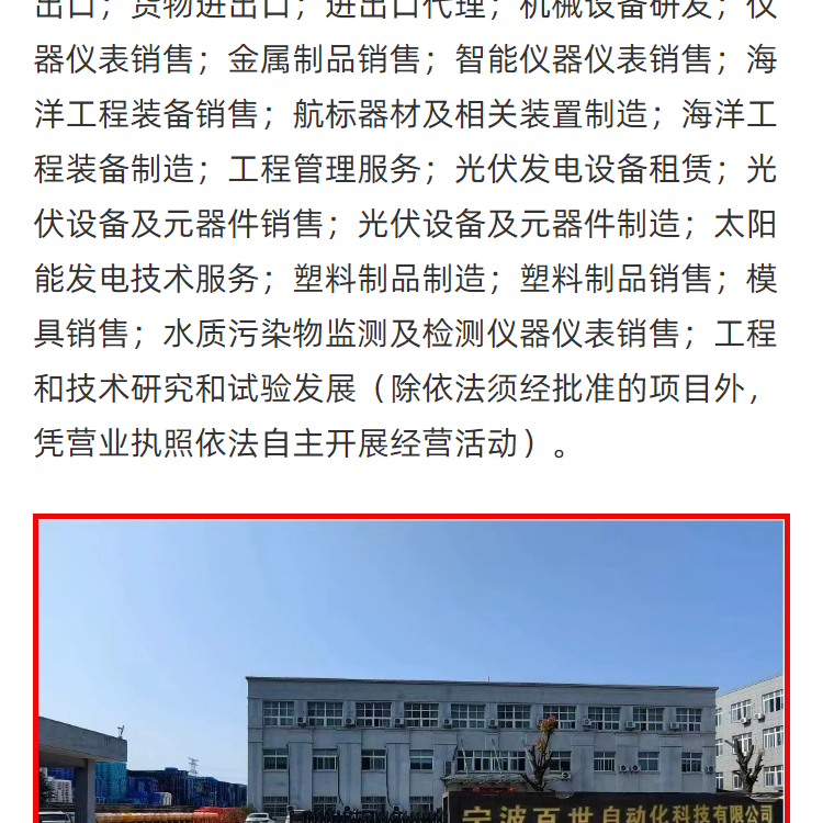 | 经营范围 | 宁波百世自动化科技有限公司成立于2019年12月16日,注册地位于浙江省慈溪滨海经济开发区香山东路155号1幢1层,法定代表人为郭亦巧。经营范围包括一般项目:技术服务、技术开发、技术咨询、技术交流、技术转让、技术推广;技术进出口;货物进出口;进出口代理;机械设备研发;仪器仪表销售;金属制品销售;智能仪器仪表销售;海洋工程装备销售;航标器材及相关装置制造;海洋工程装备制造;工程管理服务;光伏发电设备租赁;光伏设备及元器件销售;光伏设备及元器件制造;太阳能发电技术服务;塑料制品制造;塑料制品销售;模具销售;水质污染物监测及检测仪器仪表销售;工程和技术研究和试验发展(除依法须经批准的项目外,凭营业执照依法自主开展经营活动)。许可项目:输电、供电、受电电力设施的安装、维修和试验;建设工程施工;建设工程设计(依法须经批准的项目,经相关部门批准后方可开展经营活动,具体经营项目以审批结果为准) | ||