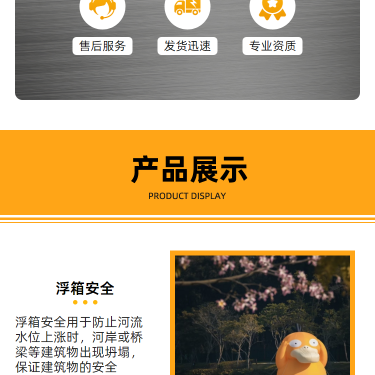 | 主营产品 | 警示浮标,管道浮筒,拦污浮筒,警示浮筒,水电站拦污排,水库河道拦污设备浮体,水上警戒线,塑料浮球,浮筒,浮标,浮漂,浮台等 | ||